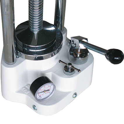 Hydraulic press, clamps up to three cuvettes. The operational elements are robust and arranged clearly. Able to hold also larger cuvettes. It reaches a maximum pressure of 400 bar and can exert a maximum force of 15.000 kg onto the cuvettes. The oil circuit is completely closed, so the press requires no maintenance at all. In order to not damage the cuvettes a maximum pressure of 250 kg / cm must not be exceeded.