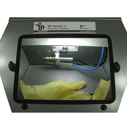 The IP Sandy 2 sandblasting machine, with a clear blasting chamber and scratch-resistant, easily interchangeable glass plate, serves for the surface radiation of metals as cleaning and polishing of ceramics, plastics etc. The machine is equipped with two separate sand containers and blasting hand pieces, which can be operated via a pneumatic foot switch and an air switcher. The inner of the cabin is equipped with two protection gloves, a drip tray and powerful LED with over 1000 Lumen. Furthermore on the bottom of the cabin is a drain plug, to be able to empty the used and filthy blasting agent. The rear wall is equipped with a pipe for the aspiration. The IP Sandy 2 can be used with alumina and glass beads from 50µm up to 250µm. The capacity of each tank is approx. 700 grams. The working pressure is adjustable between 1 and 7 bars through a pressure regulator, with integrated condense water separator.